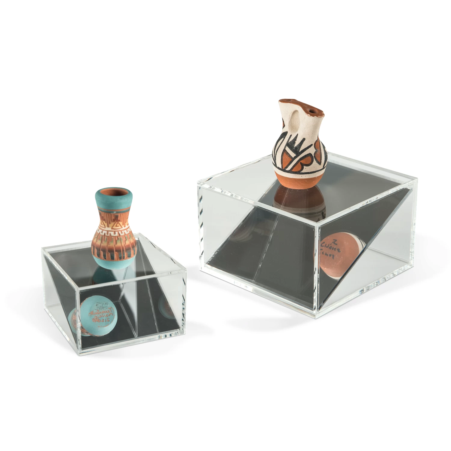 This Acrylic Angled Mirror Riser features an angled mirror that shows off the bottom of your artifact. Excellent for decorative bowls or to see the underside of a statue.