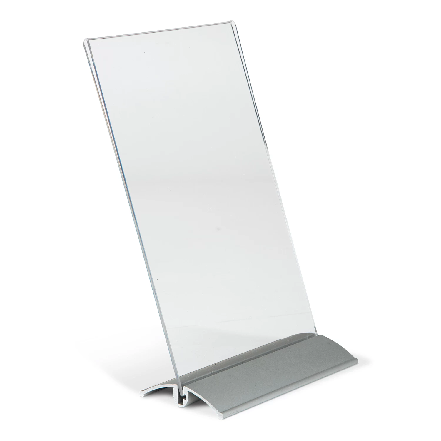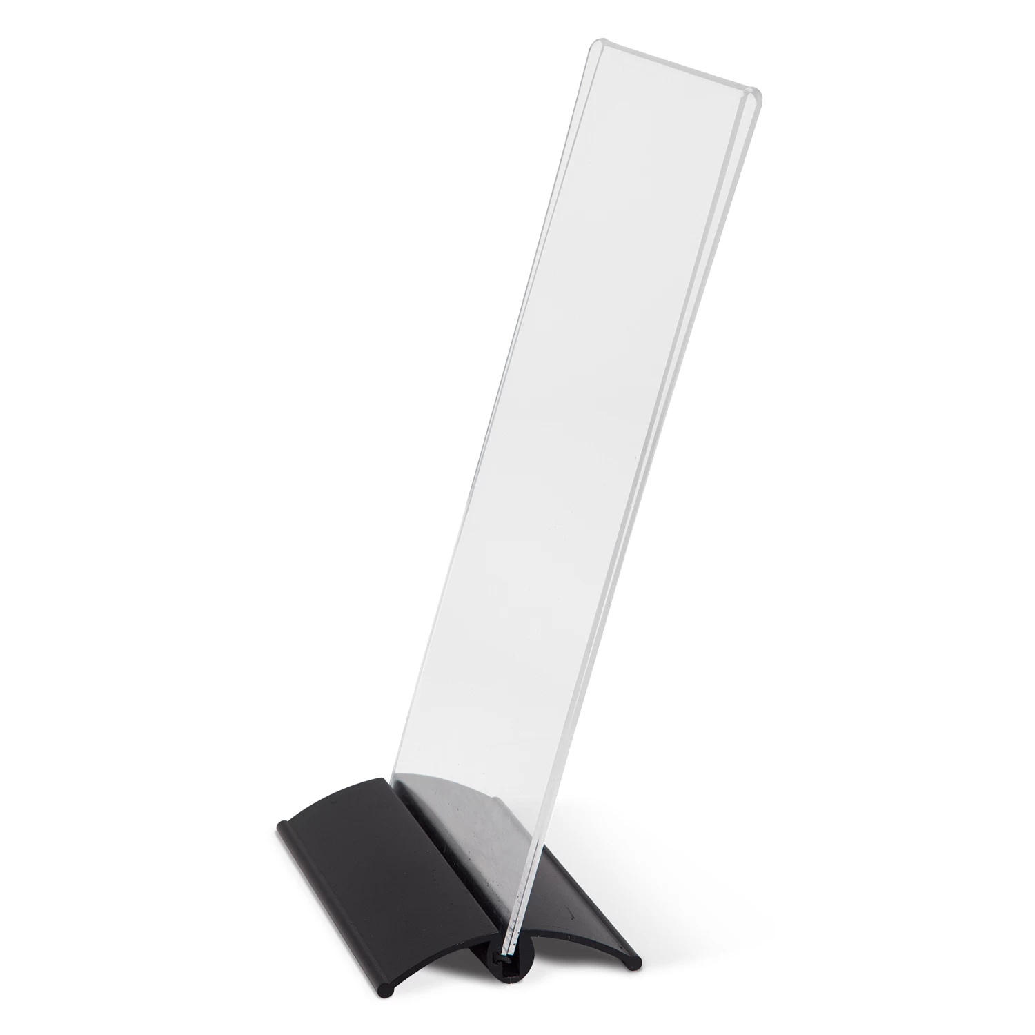 Advertise special events and display signs with this AeroLinea® Acrylic Single-Sided Tabletop Sign Holder. With a sleek metal base and clear acrylic front, this minimalist design will fit in with any décor.
