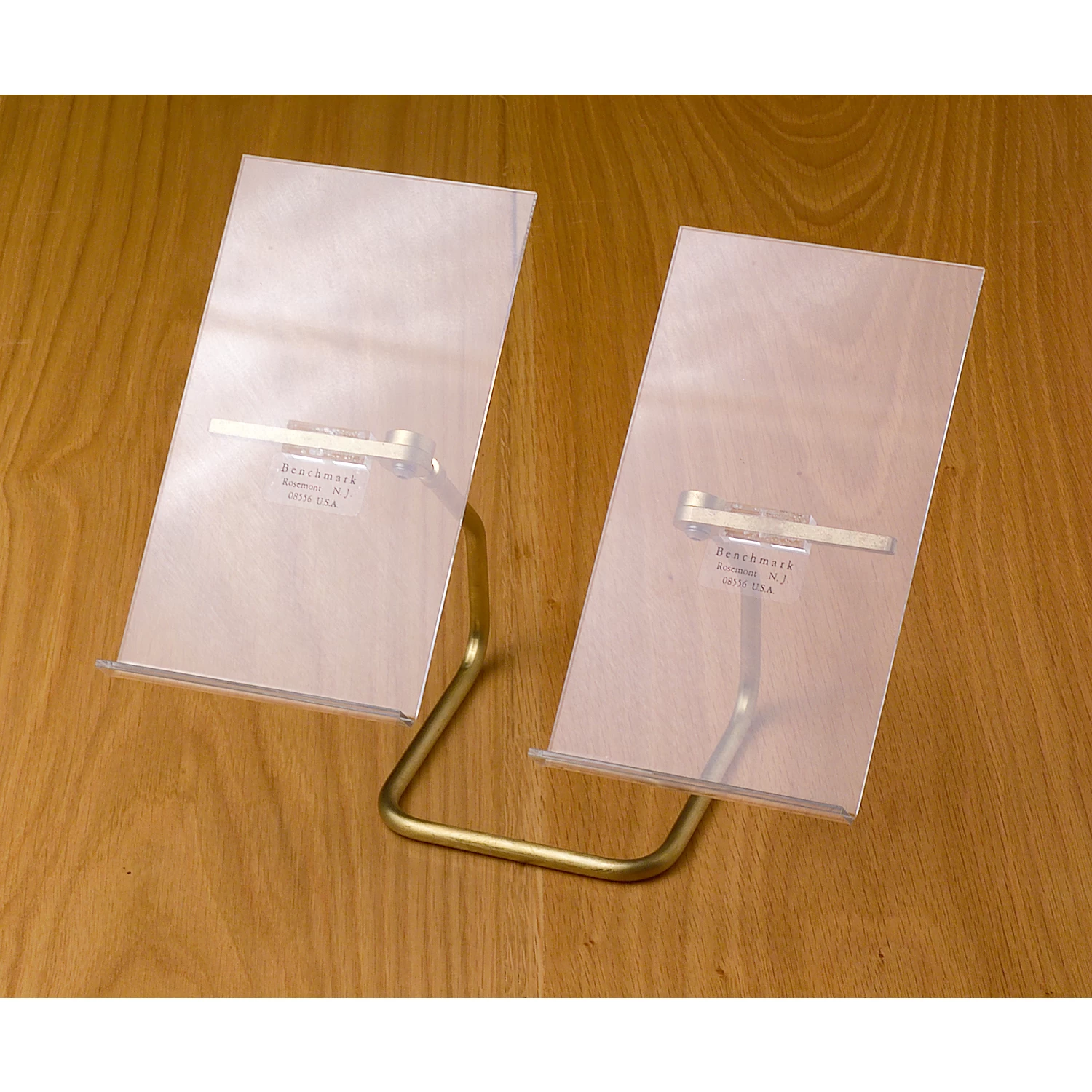 The Benchmark Plexiglass & Brass Upright Butterfly Book Mount displays books at a 40° angle. The sturdy brass rod base is fitted with two telescoping hinged brass legs, each of which holds an independently adjustable book support plate that lets you adjust the degree to which the book is open. The upright design shows the text and cover simultaneously.