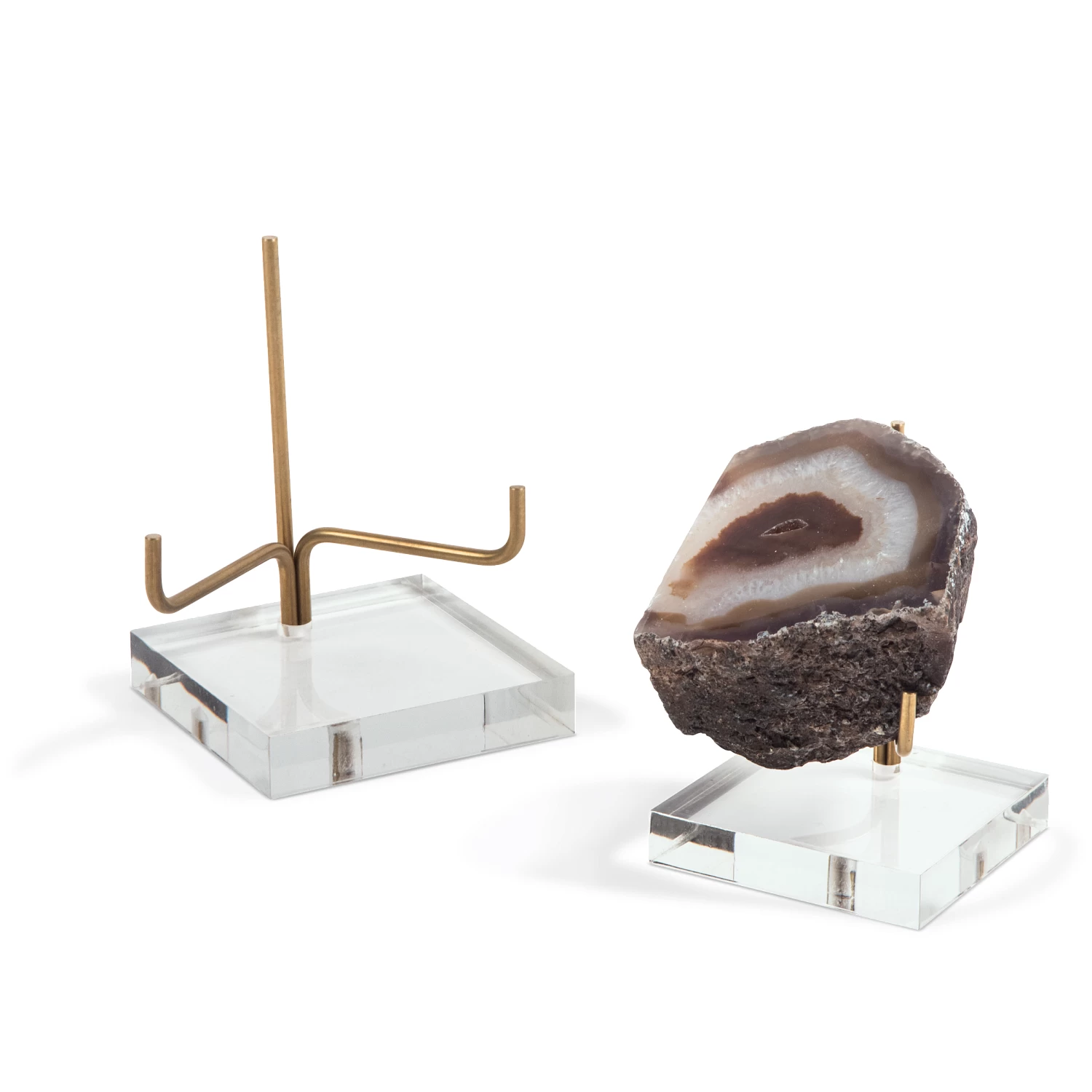 The Brass & Acrylic Single Post Back Display Easel is great for exhibiting minerals, geodes, carved stone sculptures and other heavy items. The 1 1/4″L brass arms and post are mounted in a clear acrylic base and add a tasteful display accent.