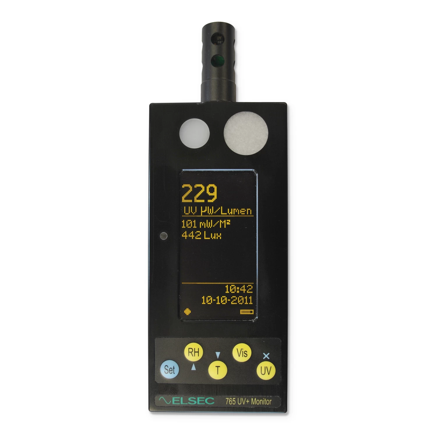 Quickly measure the four parameters that cause the most damage to artifacts and documents with the ELSEC Model 765 Handheld Environment Monitor Data Logger. It measures UV light, visible light, temperature and humidity. Regular monitoring of these factors in storage and exhibit environments helps to avoid damage to valuable collections. The data logger functionality automatically takes as many as 73,000 readings of all four parameters at selectable intervals (every 10 seconds to 1 hour) for uploading to a PC. To transfer saved data to your computer, simply plug the monitor into your PC’s USB interface. No special software is required.