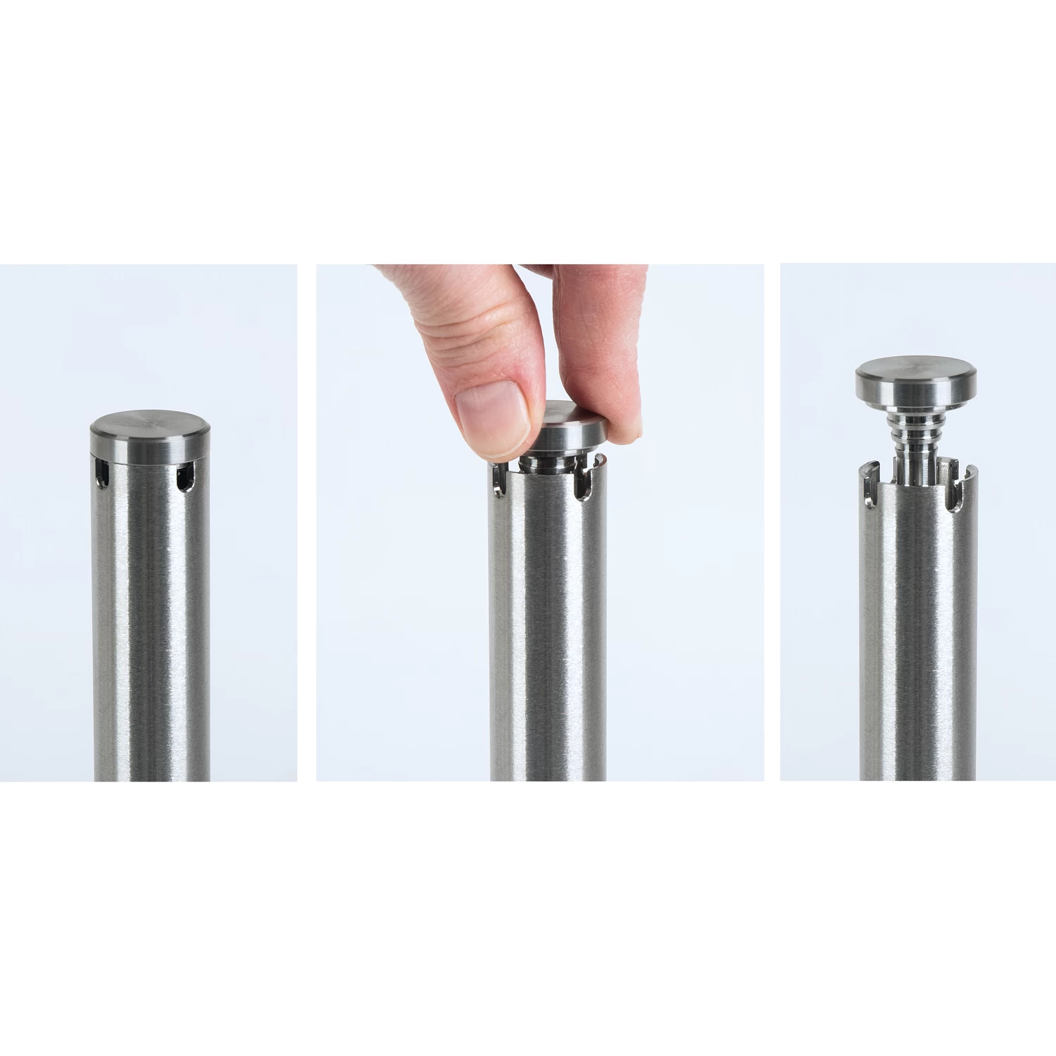 Define your exhibit spaces with these Freestanding 16″H Exhibit Barriers and Elastic Cord (sold separately) that gives to the touch to help prevent tripping. The steel base is hollow in the center to provide weight only where it’s needed, while slip-resistant neoprene pads provide grip and help protect floors. The exclusive Twist and Lock Tops to prevent loss of parts and make running the elastic cord easy.