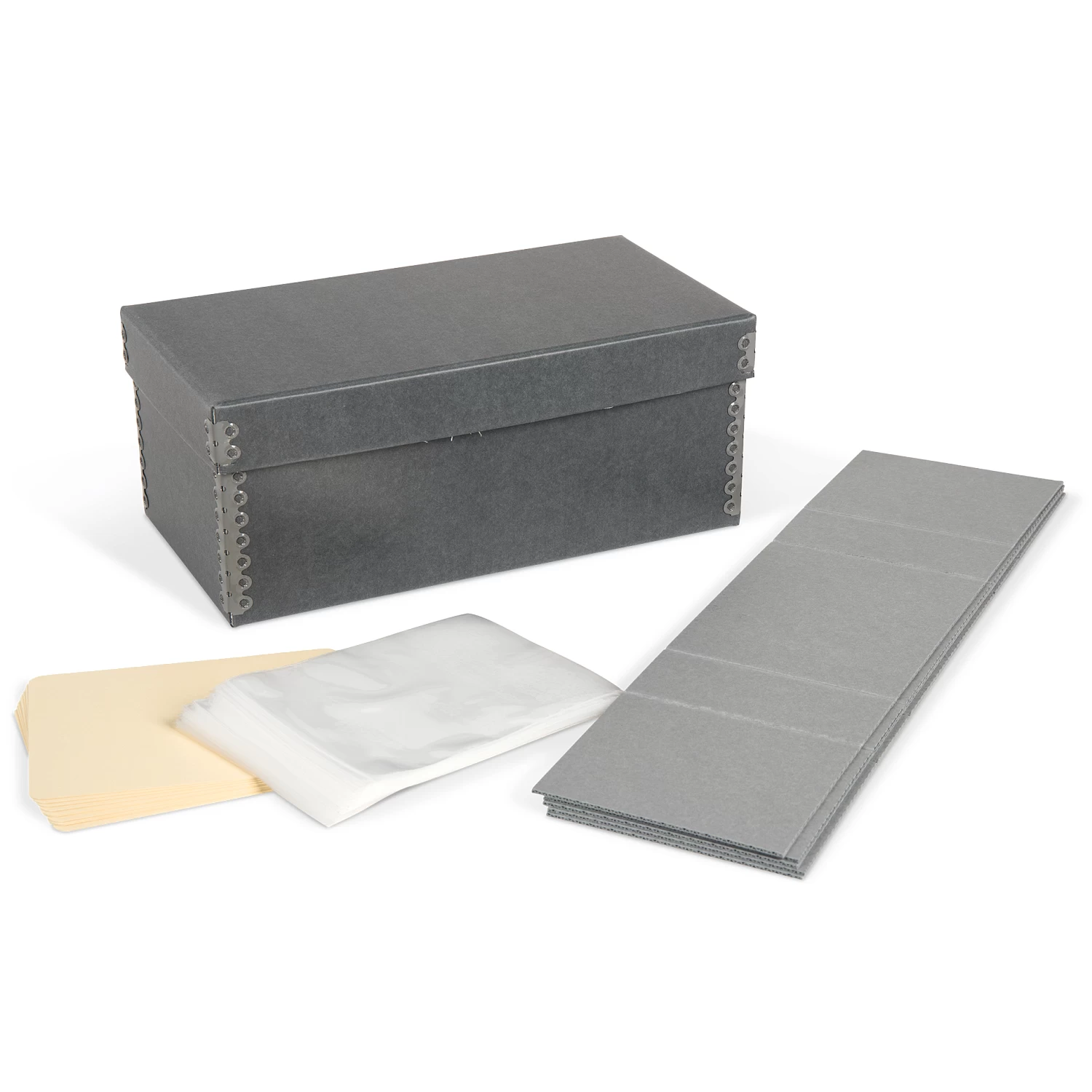 - Includes box, five e-flute spacers, ten 20 pt. folder stock index cards, and 100 2 mil polyethylene postcard envelopes