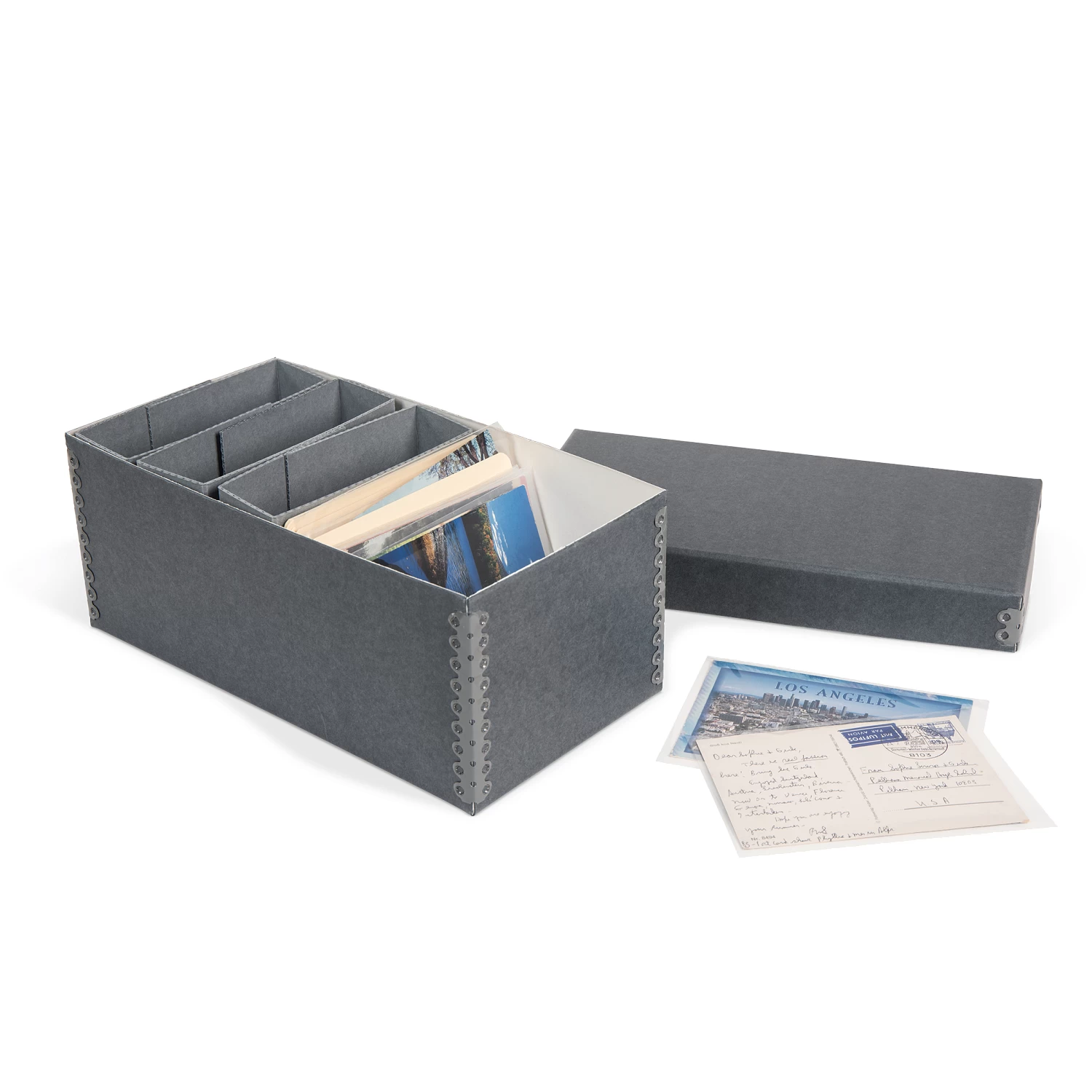Protect your vacation memories with this Gaylord Archival® Blue/Grey Postcard Preservation Kit. Use the folder stock index cards to organize your postcards by year or location. Polyethylene sleeves will protect items from damage caused by dirt, handling and light. Holds postcards up to 4 x 6″.