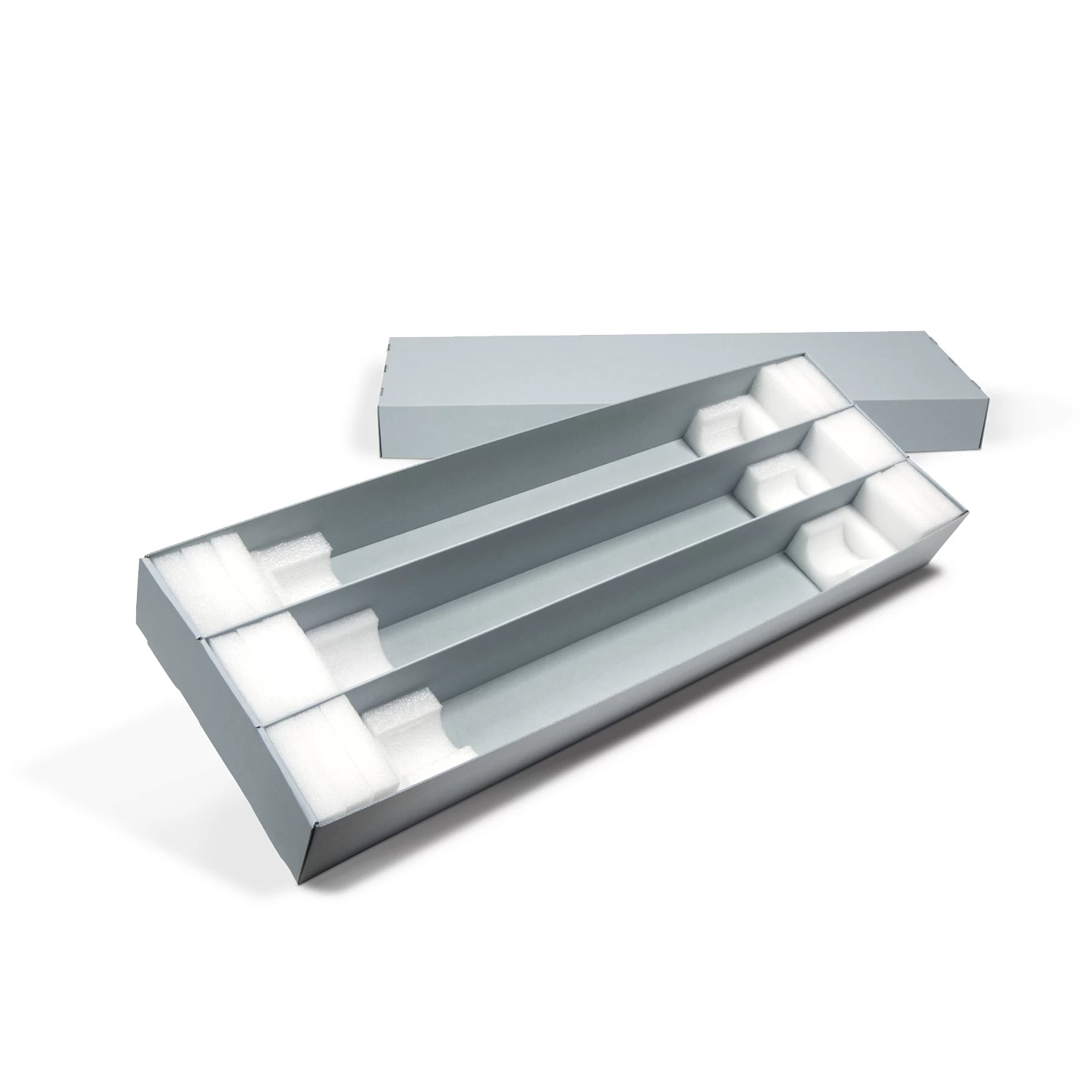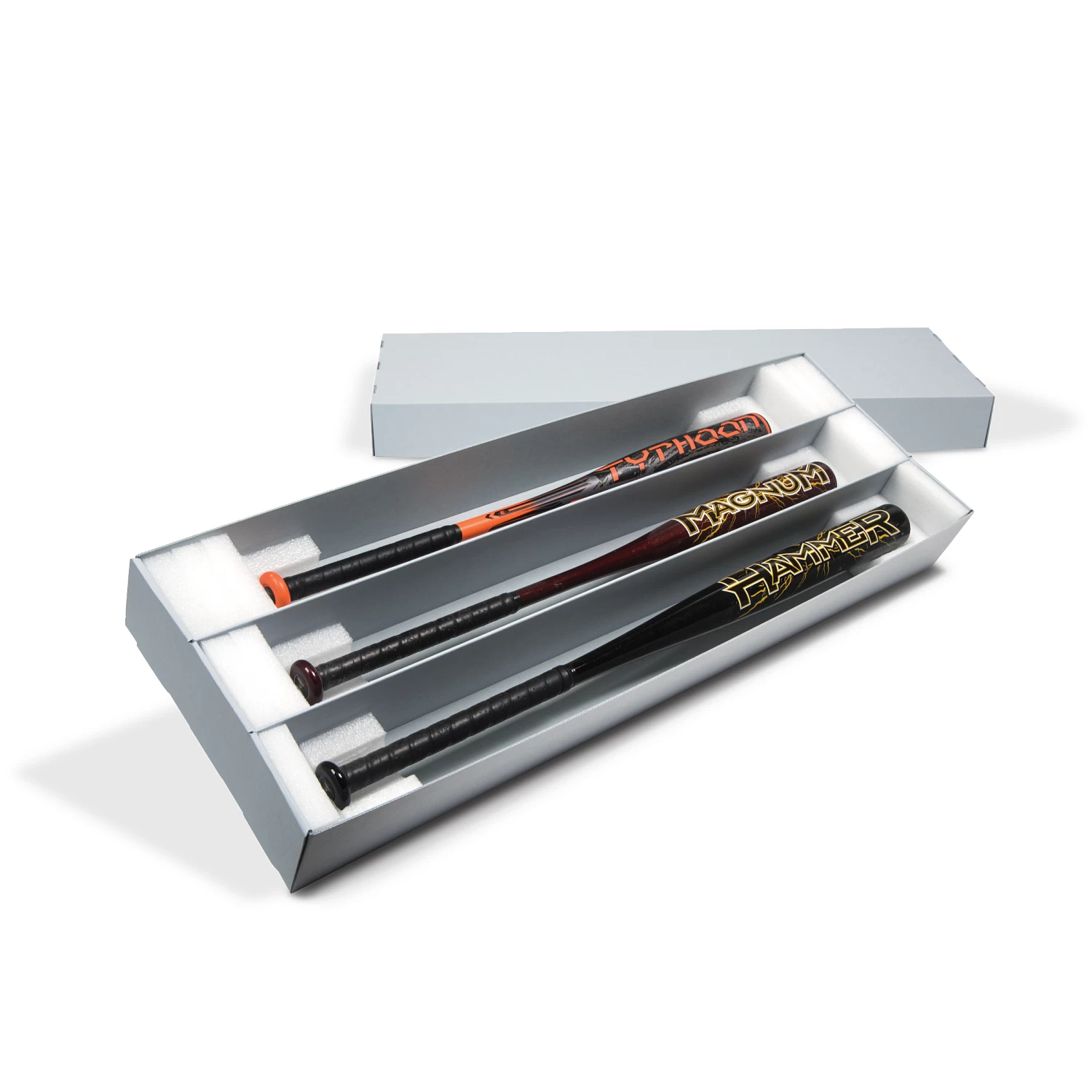 Our Gaylord Archival® E-flute Board Lid 3-Baseball Bat Box keeps collectible bats safe and clean to preserve their value. Protective cut-out polyethylene foam cradles at each end keep the bats stable, and foam spacers adjust the cradles to suit the length of your bats. The board lid protects the bats from UV damage.