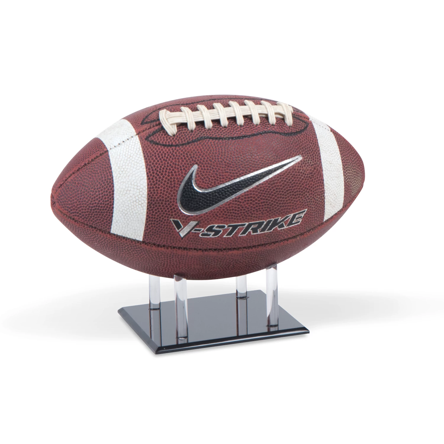 - Clear acrylic pegs hold the football up off the sleek black acrylic base in a horizontal orientation