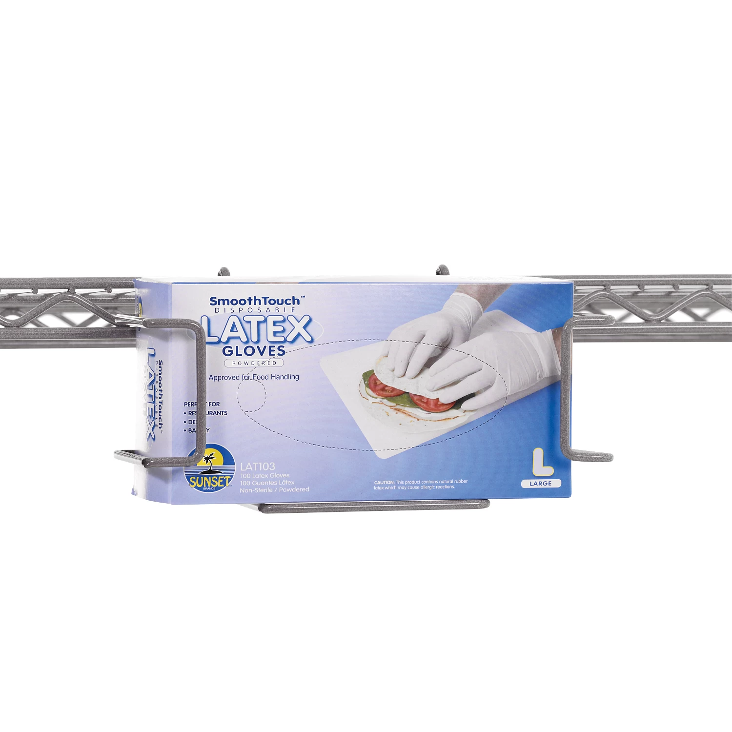 Add this Horizontal Single Glove Box Holder to wire shelving to keep gloves at hand. Steel wire has a grey rust-resistant epoxy coating with built-in Microban antimicrobial protection to inhibit growth of bacteria, mold, mildrew and fungus that cause odors and product degredation. Holds one glove box up to 3 1/2H x 10 1/8W x 6″D.