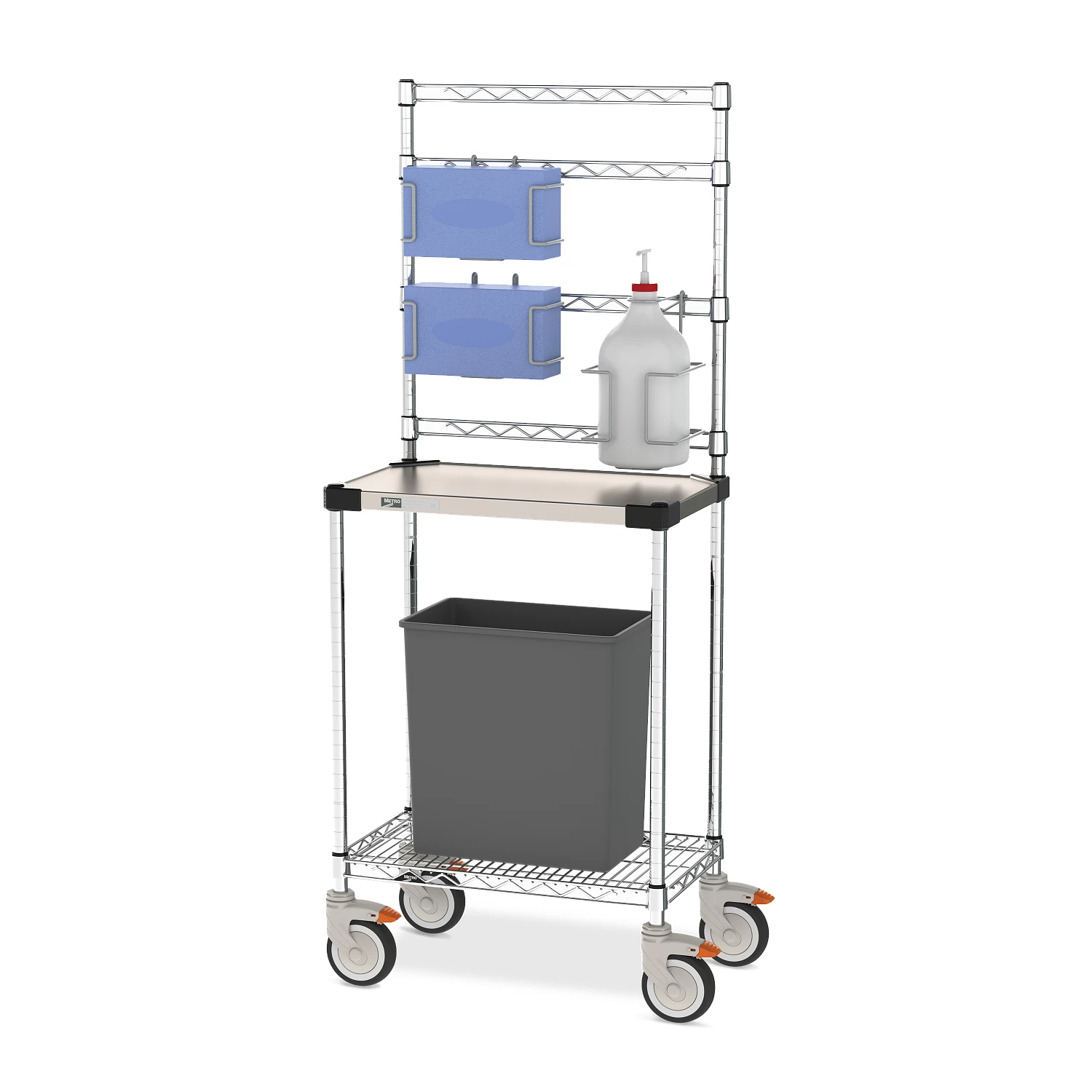 With a convenient small footprint, this Mobile Sanitization Station is perfect for storing gloves, sanitizer and other supplies. The four adjustable rails can be configured to mount signage or store different supplies. Solid stainless steel shelf is perfect for storage and is easy to clean and sanitize. Add a waste basket or store backup supplies on the bottom shelf. 5″ locking casters make the station easy to reposition and stable during use.